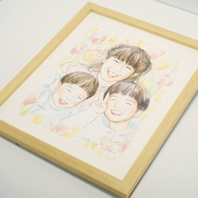 優しい似顔絵(3名) シンプルな木製フレーム入り-送料無料-
